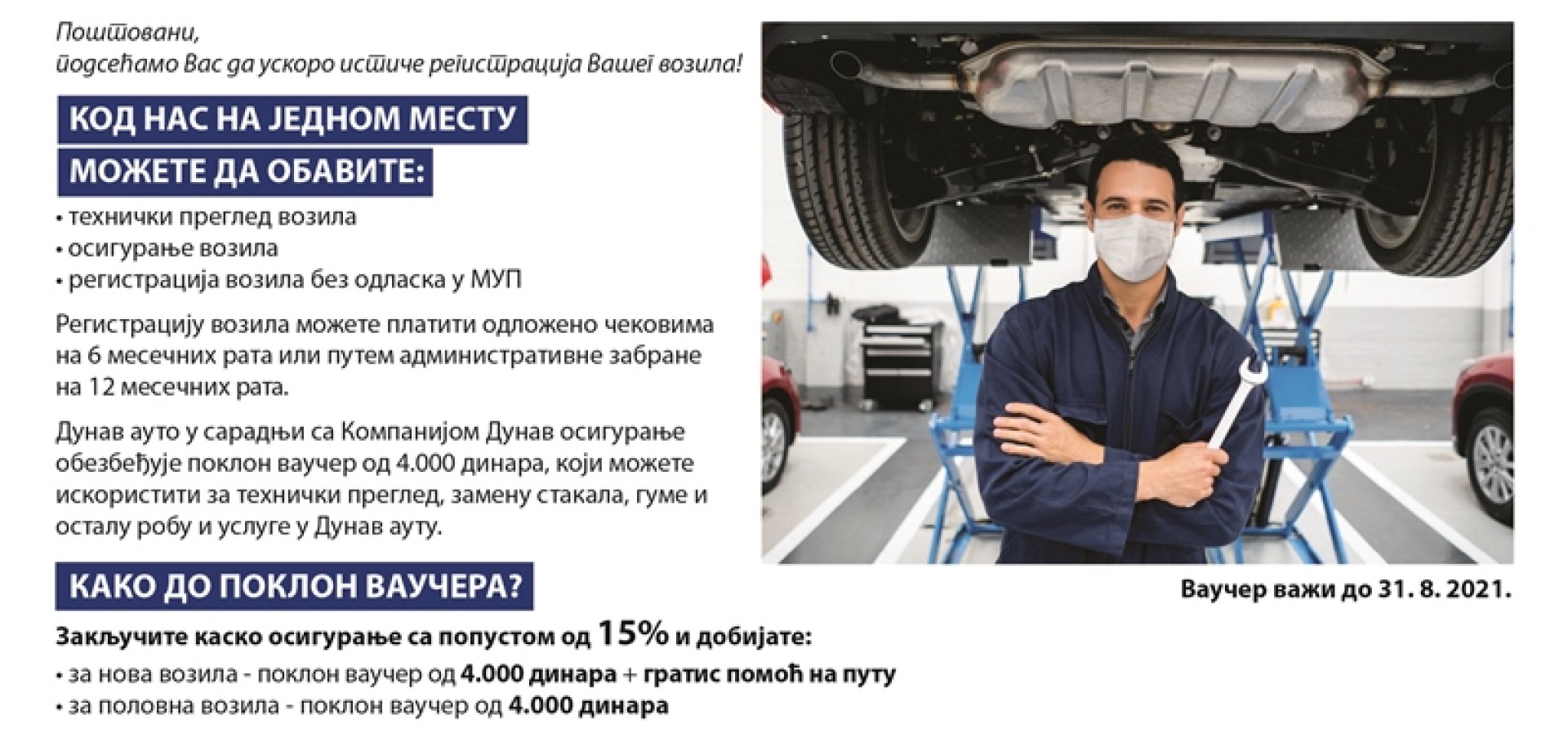 Такође поводом наведене пролећне акције одобрава се додатни поклон, за путнички и теретни програм у фиксном износу од 4.000,00 динара, који можете искористити на свим Дунав центрима и техничким прегледима Дунав аута, почев од 22.03.2021.године, до 30.04.2021. године, уз закључену полису АУТО КАСКА, за сва возила, како она која која се први пут региструју, тако и за сва остала возила, (обнова осигурања, као и уговарање осигурања за половна возила).